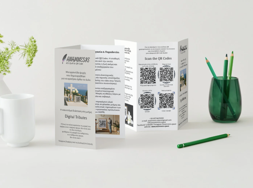 Διαβάστε ΠερισσότεραΤι περιλαμβάνει: • Τρίπτυχο φυλλάδιο Μνήμης με κείμενα λογοτεχνικά επεξεργασμένα για διαμοιρασμό στην τελετή μνήμης, με φωτογραφίες και μικρές αφιερώσεις, σαν αντίλαλοι αγάπης, προσευχής, ευγνωμοσύνης και σιωπηλής παρουσίας καθώς και τα QR Codes του πακέτου μνήμης. • Video με φωτογραφίες και αφιερωματικές φράσεις σαν φωνές φωτός μέσα σε υπερβατικό σκηνικό animation template επιλογής σας, με μικρά λόγια, εικόνες και ήχο που αναδύονται μέσα από το φως των κεριών και χάνονται στα σύννεφα. • Flipbook με βιογραφικά στοιχεία, διαδραστικές εικόνες, ήχο, φωτογραφίες και προσωπικά αφιερώματα από συγγενείς. • Ψηφιακό Κερί Candle of Anamnesis App, η εφαρμογή για το ψηφιακό κερί που μένει αναμμένο στην αιωνιότητα, με την προσωπική αφιέρωση του/της χρήστη/τριας (και με δυνατότητα επιλογής από λίστα έτοιμων φράσεων),την προαιρετική δωρεά "Αντί στεφάνου" σε Ίδρυμα επιλογής των οικείων με απευθείας σύνδεση στην επίσημη ιστοσελίδα ή νόμιμο τραπεζικό λογαριασμό του Ιδρύματος, τη δυνατότητα διαμοιρασμού στα social media ή αποστολής μέσω email. Επίσης αυτόματη ενημέρωση του/της αφιερωτή/δωρητή/προσκυνητή -τριας και των οικείων για την απόδοση τιμής στον άνθρωπό τους. • Τα δυναμικά QR Codes σε κορνίζα, plexiglass ή μάρματο και στο τρίπτυχο φυλλάδιο της τελετής καθώς και όλο το ψηφιακό παραγόμενο προϊόν σε φλασάκι μνήμης για περαιτέρω αναπαραγωγή και εκτύπωση. • Προαιρετικά δημιουργία ψηφιακής σελίδας (site) μνήμης. 📌 Η αφήγηση του βιογραφικού γίνεται μέσα από τις δικές σας απαντήσεις στα εξατομικευμένα ερωτηματολόγιά μας ή μέσω chat ή μέσω συμπλήρωσης google forms.